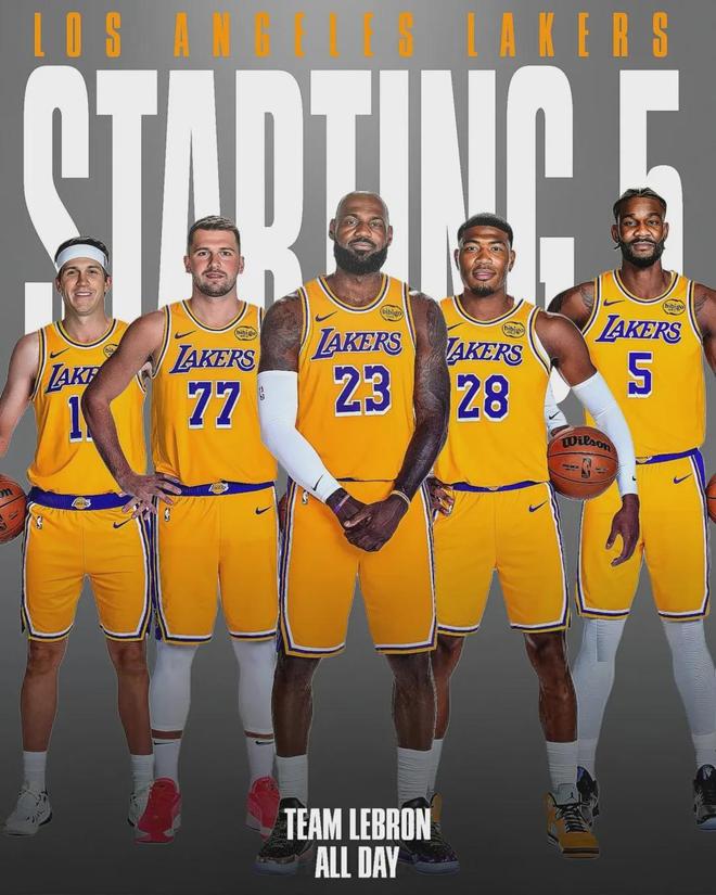 本赛季至今,东契奇场均35分9.2板9.1助1.5断,里夫斯场均28.4分5.5板6.7助1.1断,詹姆斯场均16.1分4.7板7.6助,艾顿场均15.3分8.8板1.1帽,八村塁场均14分3.9板,可以说首发五虎进攻天赋拉满。